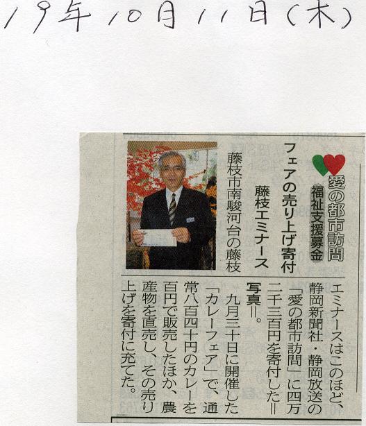 こんにちは。 先日開催したイベント(そのときのブログ記事はこちら・・・)のカレーの売上と野菜の収益を先日、静岡新聞主催の「愛の都市訪問」へ寄付いたしました。 静岡新聞藤枝支社長が、寄付金を受取りにエミナースまで来館してくださいました。 そして今日、10月11日(木)静岡新聞朝刊に記事を載せてくださいました。 ご協力してくださったお客様、どうもありがとうございました。 そして、支配人の背景の紅葉のディスプレイがとても綺麗で、記事を引き立ててくださった静岡新聞の方、どうもありがとうございましたm(__)m