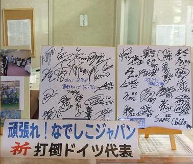 こんにちは。 7月22日から昨日まで、サッカー女子日本代表、すなわち「なでしこジャパン」が 今度のドイツ・フランス遠征のための合宿に藤枝運動公園で練習をし、 この藤枝エミナースにご宿泊されていました。 同時に、「なでしこジャパン」より少し長く、U-19の女子代表も滞在されていました。 スタッフ選手と合わせて総勢60名ほどの方がこの藤枝で合宿をし、 これから練習の成果を出しにどちらのチームも、海外遠征に行かれるそうです。 実はこの「なでしこジャパンが」藤枝エミナースに来たのは2度目で、 前回は昼食のみの来館でした。 そのときのブログ記事はこちら・・・ 前回こちらに見えたときの写真や新聞記事をフロントに色紙とともに飾っておいたところ、 みんな見てくださっていました。 お料理も美味しいと評判で、スタッフとしてはとても嬉しく感じました。 天気はいまひとつではありましたが、この藤枝での合宿がいい成果を出してくださることを期待します。