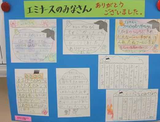 こんにちは。 プール営業が終了し、賑やかだったエミナースも 寂しく感じているものの、以前の落ち着きが戻ってきました。 それでも、この天気ですので多少のプール営業の問合せがあり、 「残念ながら・・・」というニュアンスで終了した旨を伝えているところです。 そんな中、6月にこちらに見学にみえた青島北小学校の児童さんたちが、 そのときのお礼のメッセージを書いてきてくださいました。 そのときのブログ記事はこちら・・・ プール営業が始まる前の出来事でしたので、時差は感じますが、 小学校2年生らしいことばで、一生懸命に書いてきてくれて とてもほほえましく、また嬉しく感じました。 この夏のプールにもきっと元気に泳ぎに来ていたに違いありませんね。 こちらこそ、ありがとうございましたという気持ちです♪